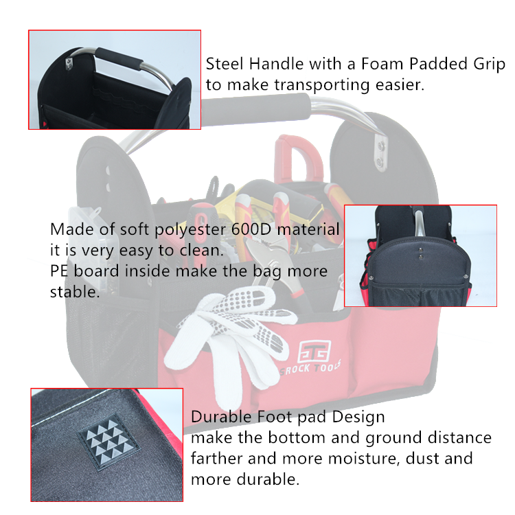 Hergestellt aus strapazierfähigem Polyester-Material ist diese Werkzeugtasche für eine lange Lebensdauer konzipiert und widerstandsfähig gegen die Beanspruchung des täglichen Gebrauchs. Der Hartboden bietet zusätzlichen Schutz für Ihre Werkzeuge und sorgt dafür, dass diese während des Transports sicher und geschützt bleiben. Der Stahlrohr-Griff ist stabil und robust, wodurch das Tragen selbst schwerer Werkzeuge mühelos möglich ist.